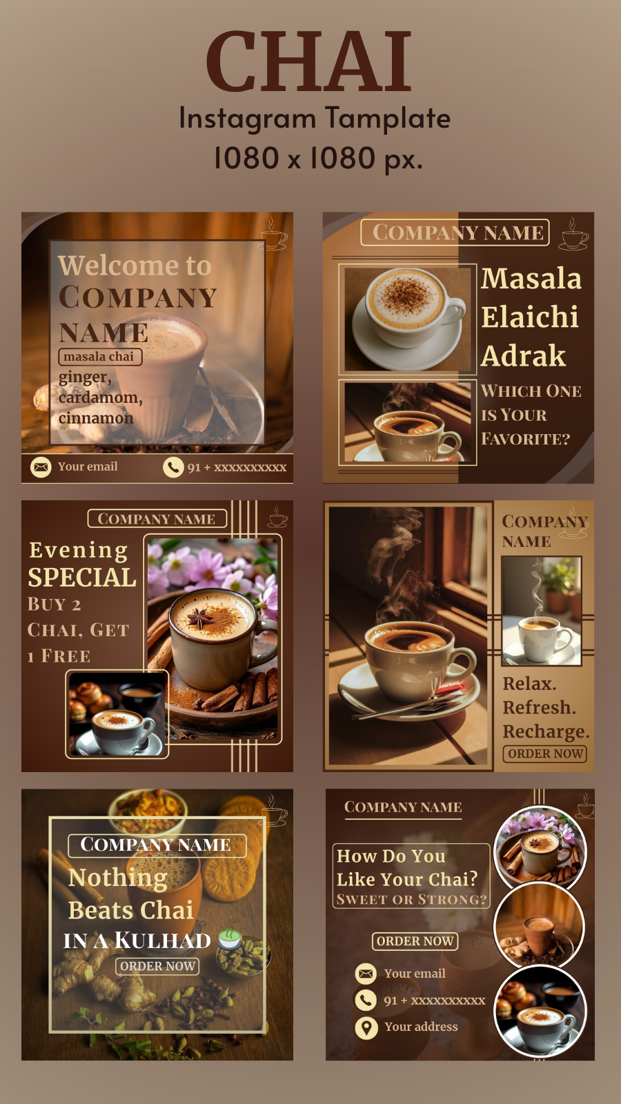 6 Instagram posts for Coffee Pack 6 Instagram posts for Chai Pack Each post includes space for: brand name, contact info, offers, and ctas, Easy-to-edit templates for brands and social media managers Eye-catching offers & engaging questions for audience interaction A balance of visual storytelling + marketing appeal